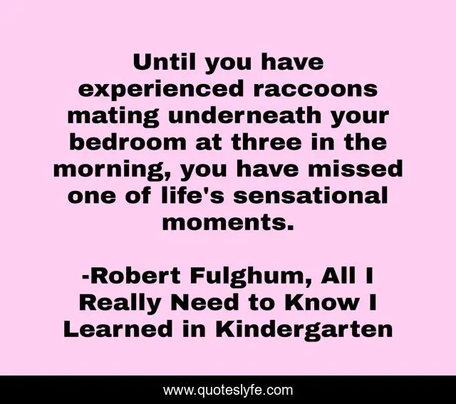 "Robert Fulghum, All I Really Need to Know I Learned in Kindergarten Quotes." Quoteslyfe.com, 2025. Mon. 08 Dec. 2025. <https://www.quoteslyfe.com/quote/Until-you-have-experienced-raccoons-mating-underneath-116607>.