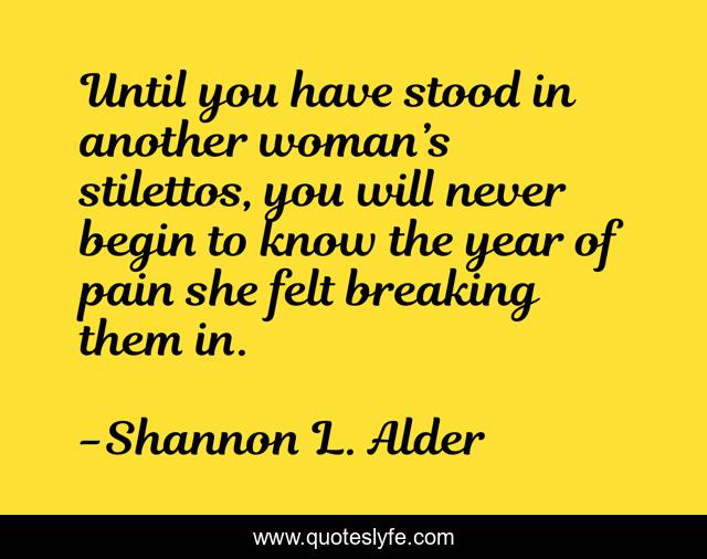 This page presents the quote "Until you have stood in another woman’s stilettos, you will never begin to know the year of pain she felt breaking them in.". Author of this quote is Shannon L. Alder. This quote is about illness, pain, no-empathy, being-ignored, sorrow, scars, lack-of-compassion, cruelty, wounds,.