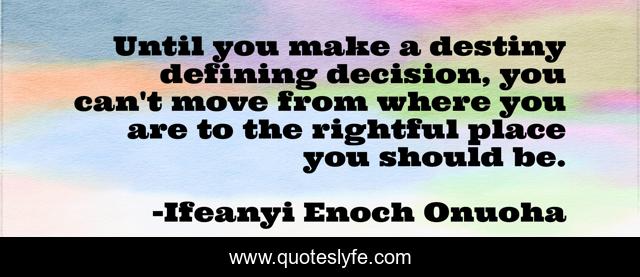 This page presents the quote "Until you make a destiny defining decision, you can't move from where you are to the rightful place you should be.". Author of this quote is Ifeanyi Enoch Onuoha. This quote is about bestselling-author, living, life, destiny, success, decision, ifeanyi-enoch-onuoha, legacy, future,.