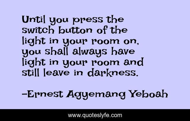 This page presents the quote "Until you press the switch button of the light in your room on, you shall always have light in your room and still leave in darkness.". Author of this quote is Ernest Agyemang Yeboah. This quote is about a-confused-life, do-something, complacency, see, joyful-living, action-than-words, talk-is-cheap, excuses, suffering,.