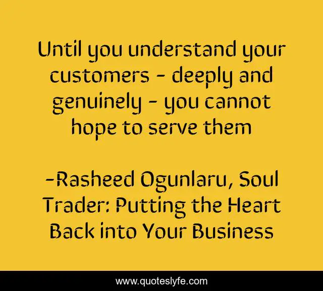 "Rasheed Ogunlaru, Soul Trader: Putting the Heart Back into Your Business Quotes." Quoteslyfe.com, 2025. Fri. 05 Dec. 2025. <https://www.quoteslyfe.com/quote/Until-you-understand-your-customers-deeply-and-129072>.