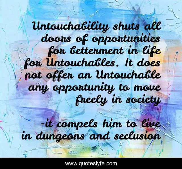 This page presents the quote "Untouchability shuts all doors of opportunities for betterment in life for Untouchables. It does not offer an Untouchable any opportunity to move freely in society". Author of this quote is it compels him to live in dungeons and seclusion. .