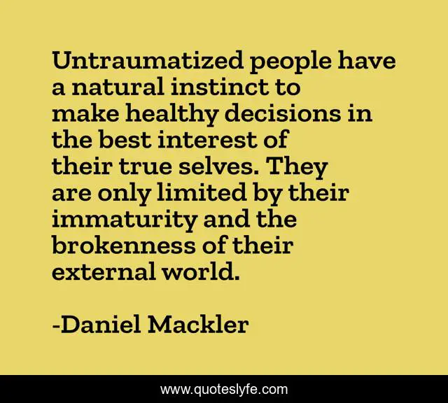 This page presents the quote "Untraumatized people have a natural instinct to make healthy decisions in the best interest of their true selves. They are only limited by their immaturity and the brokenness of their external world.". Author of this quote is Daniel Mackler. This quote is about child-abuse, psychology, self-growth, therapy, self-help, trauma,.