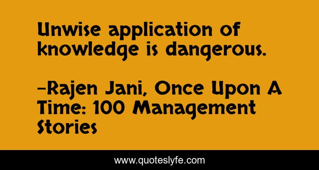 This page presents the quote "Unwise application of knowledge is dangerous.". Author of this quote is Rajen Jani, Once Upon A Time: 100 Management Stories. This quote is about motivation, communication, sales, anger, improvement, quality, management, knowledge, strategy,.
