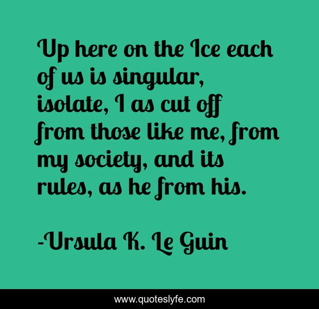 This page presents the quote "Up here on the Ice each of us is singular, isolate, I as cut off from those like me, from my society, and its rules, as he from his.". Author of this quote is Ursula K. Le Guin. This quote is about isolation, humans, ice, similarity,.