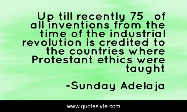 This page presents the quote "Up till recently 75% of all inventions from the time of the industrial revolution is credited to the countries where Protestant ethics were taught". Author of this quote is Sunday Adelaja. This quote is about protestant, industrial, from, countries, inventions, credited, up, till, 75,.