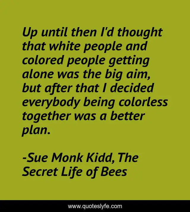 This page presents the quote "Up until then I'd thought that white people and colored people getting alone was the big aim, but after that I decided everybody being colorless together was a better plan.". Author of this quote is Sue Monk Kidd, The Secret Life of Bees. This quote is about black-people, racism, white-people,.