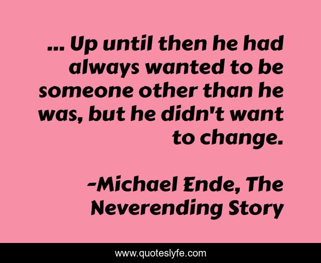 This page presents the quote "... Up until then he had always wanted to be someone other than he was, but he didn't want to change.". Author of this quote is Michael Ende, The Neverending Story. This quote is about choices, confidence, comfort-zone, change, self-worth,.