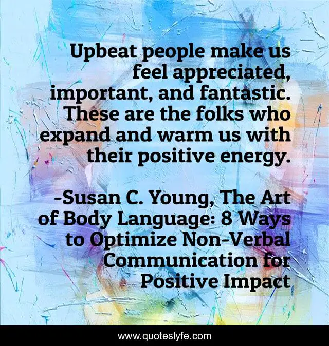 "Susan C. Young, The Art of Body Language: 8 Ways to Optimize Non-Verbal Communication for Positive Impact Quotes." Quoteslyfe.com, 2025. Sat. 06 Dec. 2025. <https://www.quoteslyfe.com/quote/Upbeat-people-make-us-feel-appreciated-important-227420>.