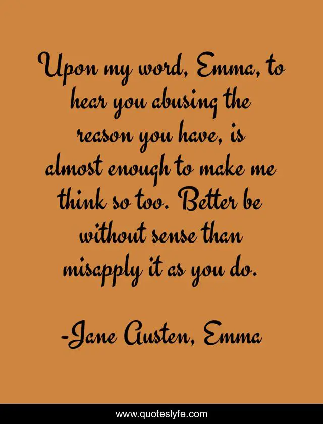 This page presents the quote "Upon my word, Emma, to hear you abusing the reason you have, is almost enough to make me think so too. Better be without sense than misapply it as you do.". Author of this quote is Jane Austen, Emma. This quote is about reason, sense,.
