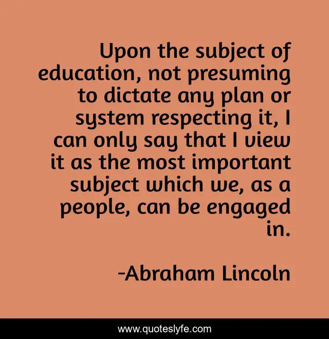 This page presents the quote "Upon the subject of education, not presuming to dictate any plan or system respecting it, I can only say that I view it as the most important subject which we, as a people, can be engaged in.". Author of this quote is Abraham Lincoln. This quote is about people, plan, view,.