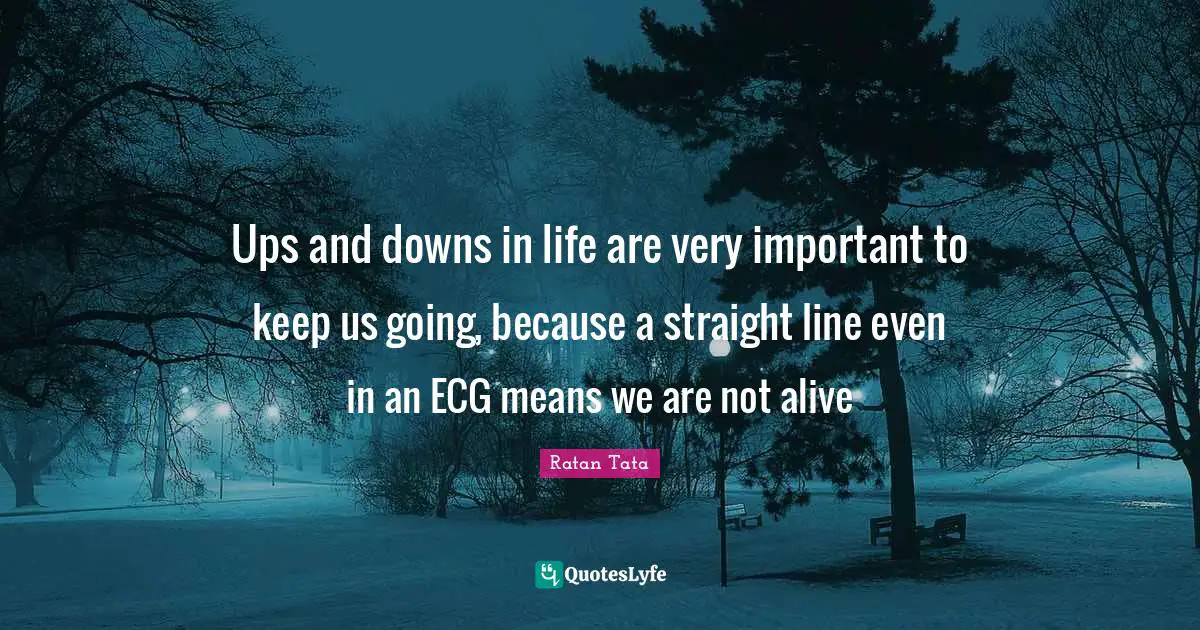This page presents the quote "Ups and downs in life are very important to keep us going, because a straight line even in an ECG means we are not alive". Author of this quote is Ratan Tata. This quote is about important, encouraging, moving on, alive, life, uplifting,.