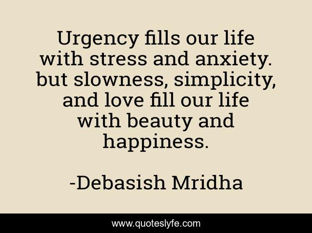 This page presents the quote "Urgency fills our life with stress and anxiety. but slowness, simplicity, and love fill our life with beauty and happiness.". Author of this quote is Debasish Mridha. This quote is about life, love, knowledge, inspirational, intelligence, philosophy, wisdom, quotes, affection,.