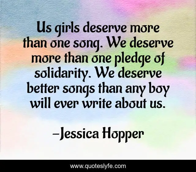 This page presents the quote "Us girls deserve more than one song. We deserve more than one pledge of solidarity. We deserve better songs than any boy will ever write about us.". Author of this quote is Jessica Hopper. This quote is about girls, music,.