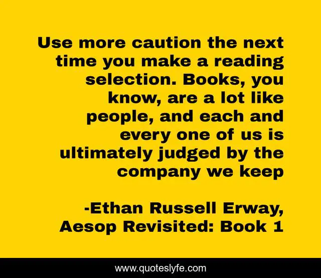 This page presents the quote "Use more caution the next time you make a reading selection. Books, you know, are a lot like people, and each and every one of us is ultimately judged by the company we keep". Author of this quote is Ethan Russell Erway, Aesop Revisited: Book 1. This quote is about books, reading,.
