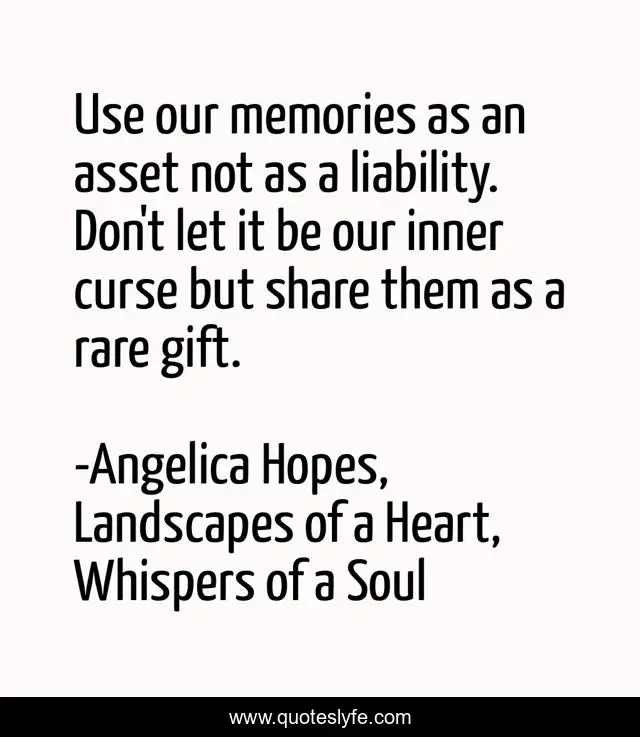 "Angelica Hopes, Landscapes of a Heart, Whispers of a Soul Quotes." Quoteslyfe.com, 2025. Fri. 05 Dec. 2025. <https://www.quoteslyfe.com/quote/Use-our-memories-as-an-asset-not-88859>.