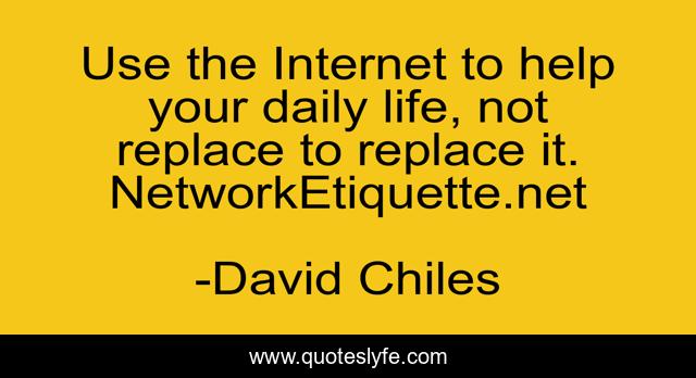 This page presents the quote "Use the Internet to help your daily life, not replace to replace it. NetworkEtiquette.net". Author of this quote is David Chiles. This quote is about social-media, twitter, in-real-life, linkedin, netiquette, facebook,.