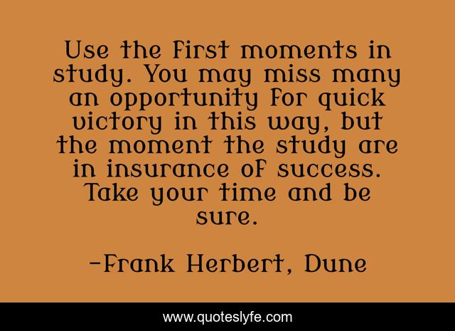 This page presents the quote "Use the first moments in study. You may miss many an opportunity for quick victory in this way, but the moment the study are in insurance of success. Take your time and be sure.". Author of this quote is Frank Herbert, Dune. This quote is about patience, haste,.