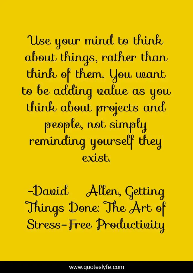 This page presents the quote "Use your mind to think about things, rather than think of them. You want to be adding value as you think about projects and people, not simply reminding yourself they exist.". Author of this quote is David Allen, Getting Things Done: The Art of Stress-Free Productivity. This quote is about gtd, actions, value,.