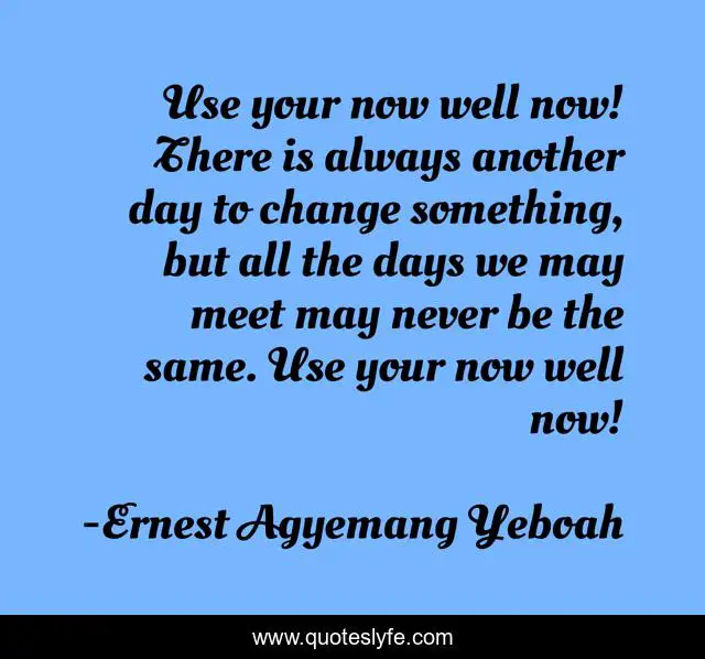 This page presents the quote "Use your now well now! There is always another day to change something, but all the days we may meet may never be the same. Use your now well now!". Author of this quote is Ernest Agyemang Yeboah. This quote is about mind-your-time, time-passing, chances, do-something-today, opportunities-in-life, plan-well, change,.