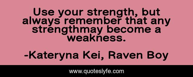 This page presents the quote "Use your strength, but always remember that any strengthmay become a weakness.". Author of this quote is Kateryna Kei, Raven Boy. This quote is about life, inspirational, survival, wisdom, ranve-boy, life-lessons, wisdom-in-fiction, enthusiasm, raven-boy,.