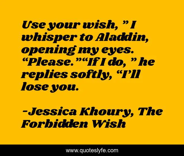 "Jessica Khoury, The Forbidden Wish Quotes." Quoteslyfe.com, 2025. Fri. 05 Dec. 2025. <https://www.quoteslyfe.com/quote/Use-your-wish-I-whisper-to-Aladdin-258605>.