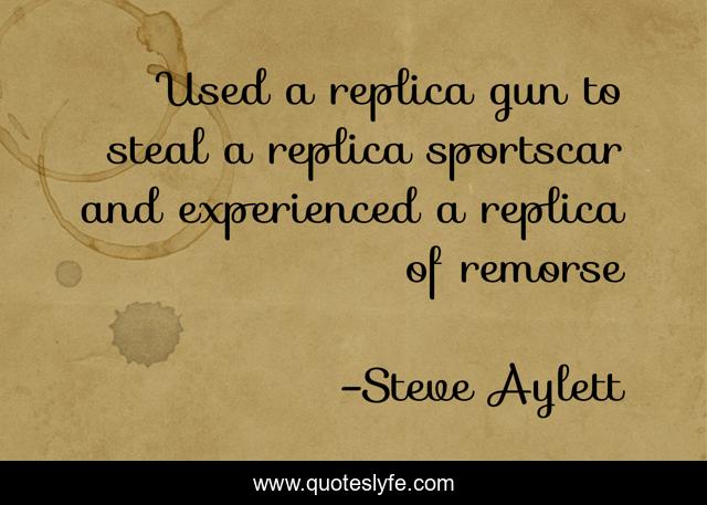 This page presents the quote "Used a replica gun to steal a replica sportscar and experienced a replica of remorse". Author of this quote is Steve Aylett. This quote is about humor, life, love, experience, affection,.