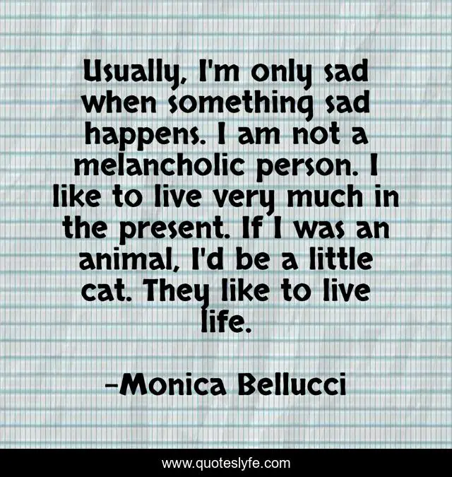 This page presents the quote "Usually, I'm only sad when something sad happens. I am not a melancholic person. I like to live very much in the present. If I was an animal, I'd be a little cat. They like to live life.". Author of this quote is Monica Bellucci. This quote is about life, live life, animal,.