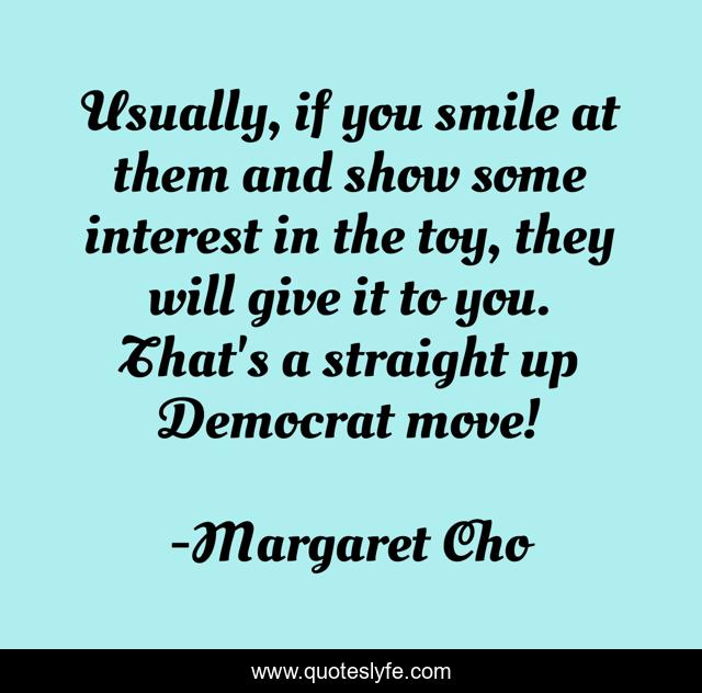 This page presents the quote "Usually, if you smile at them and show some interest in the toy, they will give it to you. That's a straight up Democrat move!". Author of this quote is Margaret Cho. This quote is about straight, toy,.