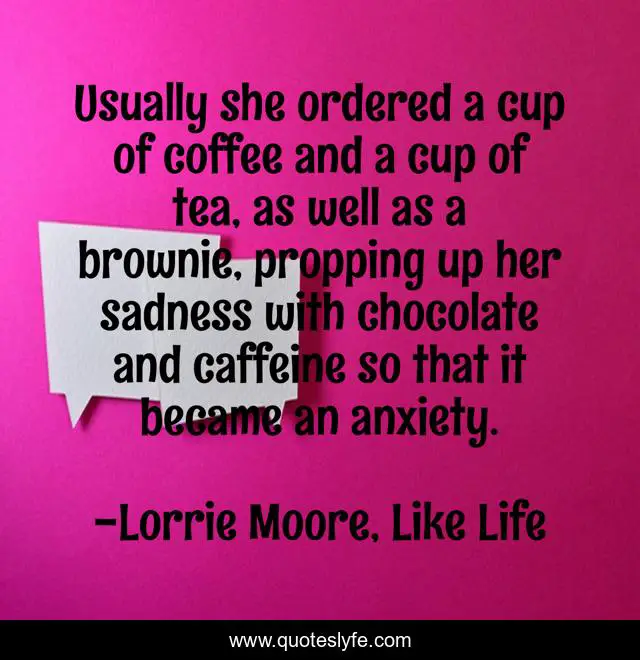 This page presents the quote "Usually she ordered a cup of coffee and a cup of tea, as well as a brownie, propping up her sadness with chocolate and caffeine so that it became an anxiety.". Author of this quote is Lorrie Moore, Like Life. This quote is about sadness, anxiety,.