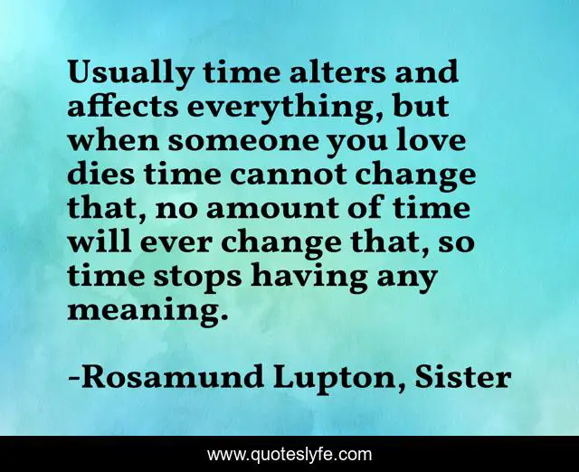 This page presents the quote "Usually time alters and affects everything, but when someone you love dies time cannot change that, no amount of time will ever change that, so time stops having any meaning.". Author of this quote is Rosamund Lupton, Sister. This quote is about missing, death, love, affection, time,.