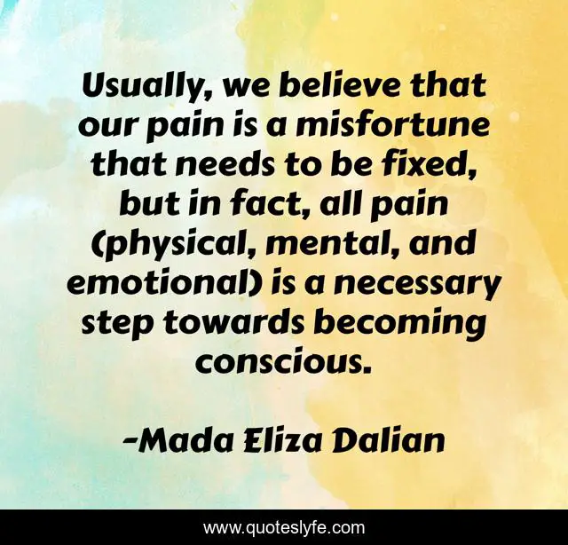 This page presents the quote "Usually, we believe that our pain is a misfortune that needs to be fixed, but in fact, all pain (physical, mental, and emotional) is a necessary step towards becoming conscious.". Author of this quote is Mada Eliza Dalian. This quote is about enthusiasm, spiritual, health, inspirational,.