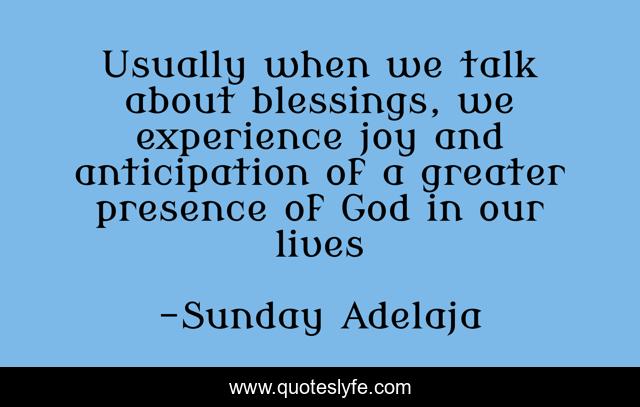 This page presents the quote "Usually when we talk about blessings, we experience joy and anticipation of a greater presence of God in our lives". Author of this quote is Sunday Adelaja. This quote is about anticipation, greater, presence, god, experience, blessings, lives, joy, talk,.