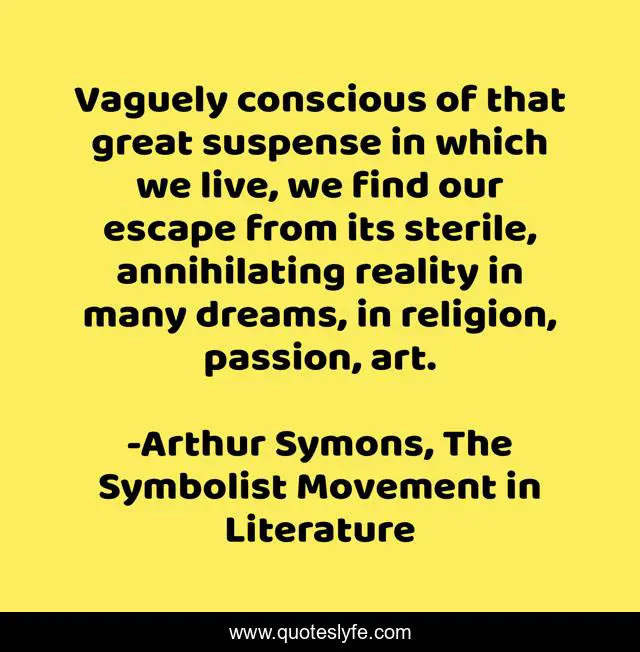 This page presents the quote "Vaguely conscious of that great suspense in which we live, we find our escape from its sterile, annihilating reality in many dreams, in religion, passion, art.". Author of this quote is Arthur Symons, The Symbolist Movement in Literature. This quote is about art, religion, suspense, throbbing-gristle, escape, dreams,.