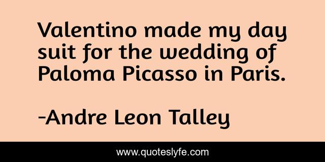 This page presents the quote "Valentino made my day suit for the wedding of Paloma Picasso in Paris.". Author of this quote is Andre Leon Talley. This quote is about paris, day, suit,.