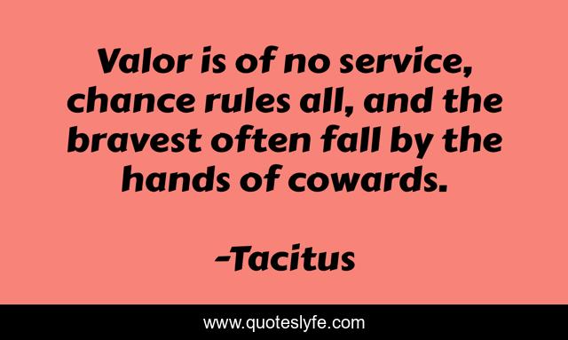 This page presents the quote "Valor is of no service, chance rules all, and the bravest often fall by the hands of cowards.". Author of this quote is Tacitus. This quote is about rules, service, fall,.