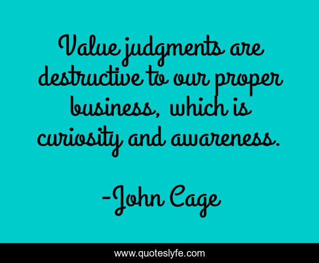 This page presents the quote "Value judgments are destructive to our proper business, which is curiosity and awareness.". Author of this quote is John Cage. This quote is about awareness, curiosity, value,.