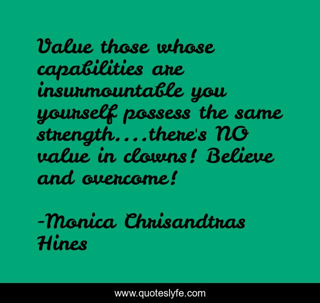 This page presents the quote "Value those whose capabilities are insurmountable you yourself possess the same strength....there's NO value in clowns! Believe and overcome!". Author of this quote is Monica Chrisandtras Hines. This quote is about perseverance, strength, self-esteem,.