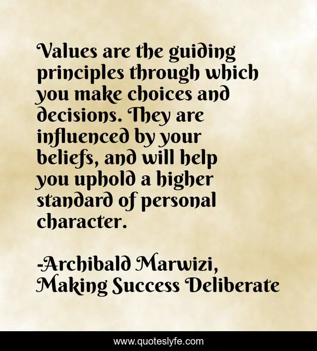 This page presents the quote "Values are the guiding principles through which you make choices and decisions. They are influenced by your beliefs, and will help you uphold a higher standard of personal character.". Author of this quote is Archibald Marwizi, Making Success Deliberate. This quote is about life, success, behaviour, attitude, legacy, growth, purpose, inspirational, leadership,.