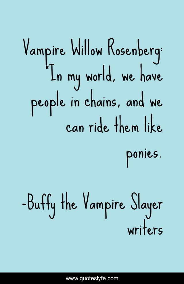 This page presents the quote "Vampire Willow Rosenberg: "In my world, we have people in chains, and we can ride them like ponies.". Author of this quote is Buffy the Vampire Slayer writers. This quote is about humans, slavery, buffy-the-vampire-slayer,.