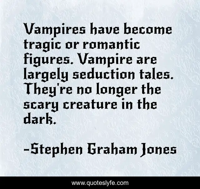 This page presents the quote "Vampires have become tragic or romantic figures. Vampire are largely seduction tales. They're no longer the scary creature in the dark.". Author of this quote is Stephen Graham Jones. This quote is about dark, scary, vampire,.
