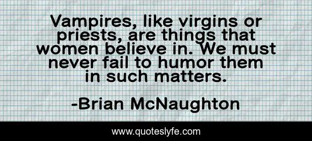 This page presents the quote "Vampires, like virgins or priests, are things that women believe in. We must never fail to humor them in such matters.". Author of this quote is Brian McNaughton. This quote is about religion, vampires, women,.