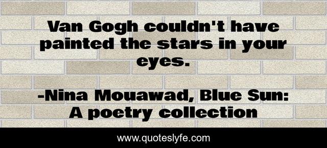 This page presents the quote "Van Gogh couldn't have painted the stars in your eyes.". Author of this quote is Nina Mouawad, Blue Sun: A poetry collection. This quote is about eyes, van-gogh, art, sun, moon, stars, eye-contact, love, astronomy,.