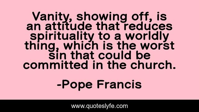 This page presents the quote "Vanity, showing off, is an attitude that reduces spirituality to a worldly thing, which is the worst sin that could be committed in the church.". Author of this quote is Pope Francis. This quote is about vanity, sin, church,.