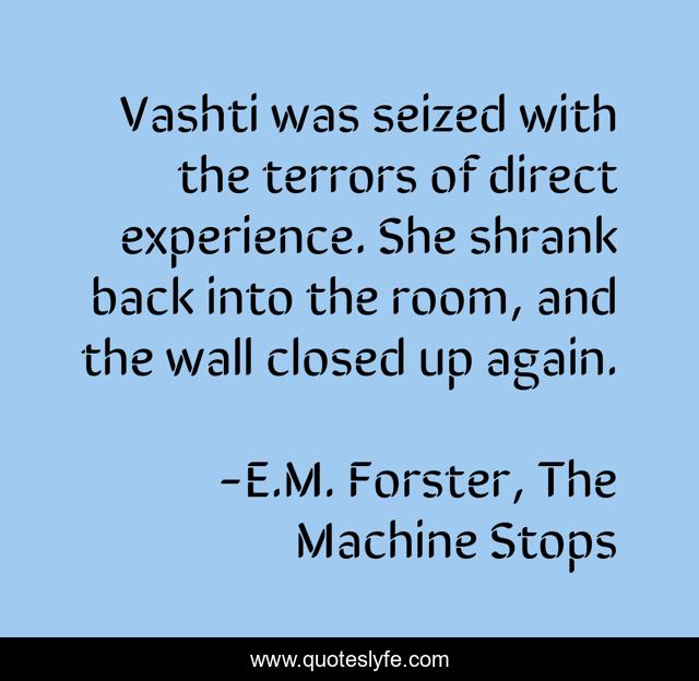 This page presents the quote "Vashti was seized with the terrors of direct experience. She shrank back into the room, and the wall closed up again.". Author of this quote is E.M. Forster, The Machine Stops. This quote is about machine, direct-experience, science-fiction, isolation,.