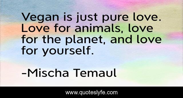 This page presents the quote "Vegan is just pure love. Love for animals, love for the planet, and love for yourself.". Author of this quote is Mischa Temaul. This quote is about veganism, love, animal-rights, vegan, humans-and-animals, planet-earth, animals, affection,.