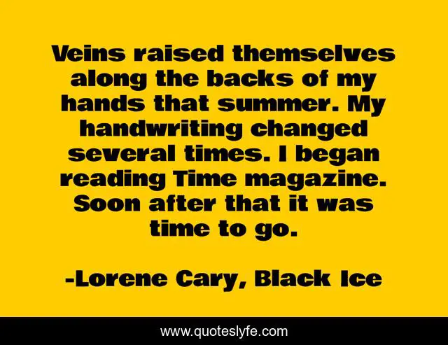 This page presents the quote "Veins raised themselves along the backs of my hands that summer. My handwriting changed several times. I began reading Time magazine. Soon after that it was time to go.". Author of this quote is Lorene Cary, Black Ice. .