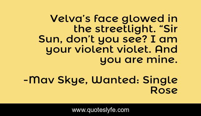 This page presents the quote "Velva’s face glowed in the streetlight. “Sir Sun, don’t you see? I am your violent violet. And you are mine.". Author of this quote is Mav Skye, Wanted: Single Rose. This quote is about horror, comedy, femme-fatale,.