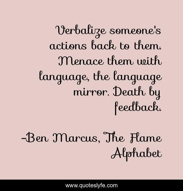 This page presents the quote "Verbalize someone's actions back to them. Menace them with language, the language mirror. Death by feedback.". Author of this quote is Ben Marcus, The Flame Alphabet. .