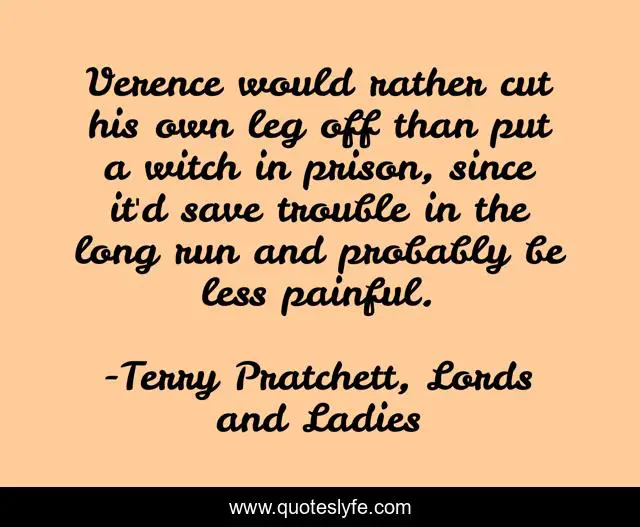 This page presents the quote "Verence would rather cut his own leg off than put a witch in prison, since it'd save trouble in the long run and probably be less painful.". Author of this quote is Terry Pratchett, Lords and Ladies. .